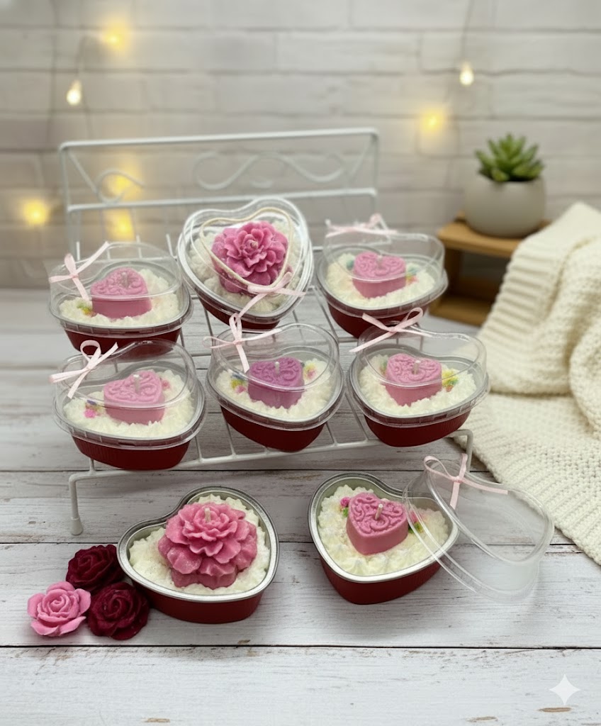 Indulge in the sweet scent of this adorable “Heartfelt Treat” candle. Shaped like a mini cake, this heart-shaped candle is the perfect size for a small space or as a thoughtful gift. Let the warm glow and sweet aroma create a romantic and cozy atmosphere.